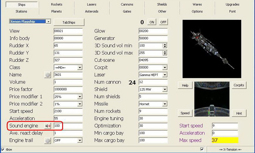 Звук двигателя Кенонского Флагмана М0 прописан под номером 100, но в папке "S" такого файла нет. Нужно заменить на 101 или 102.