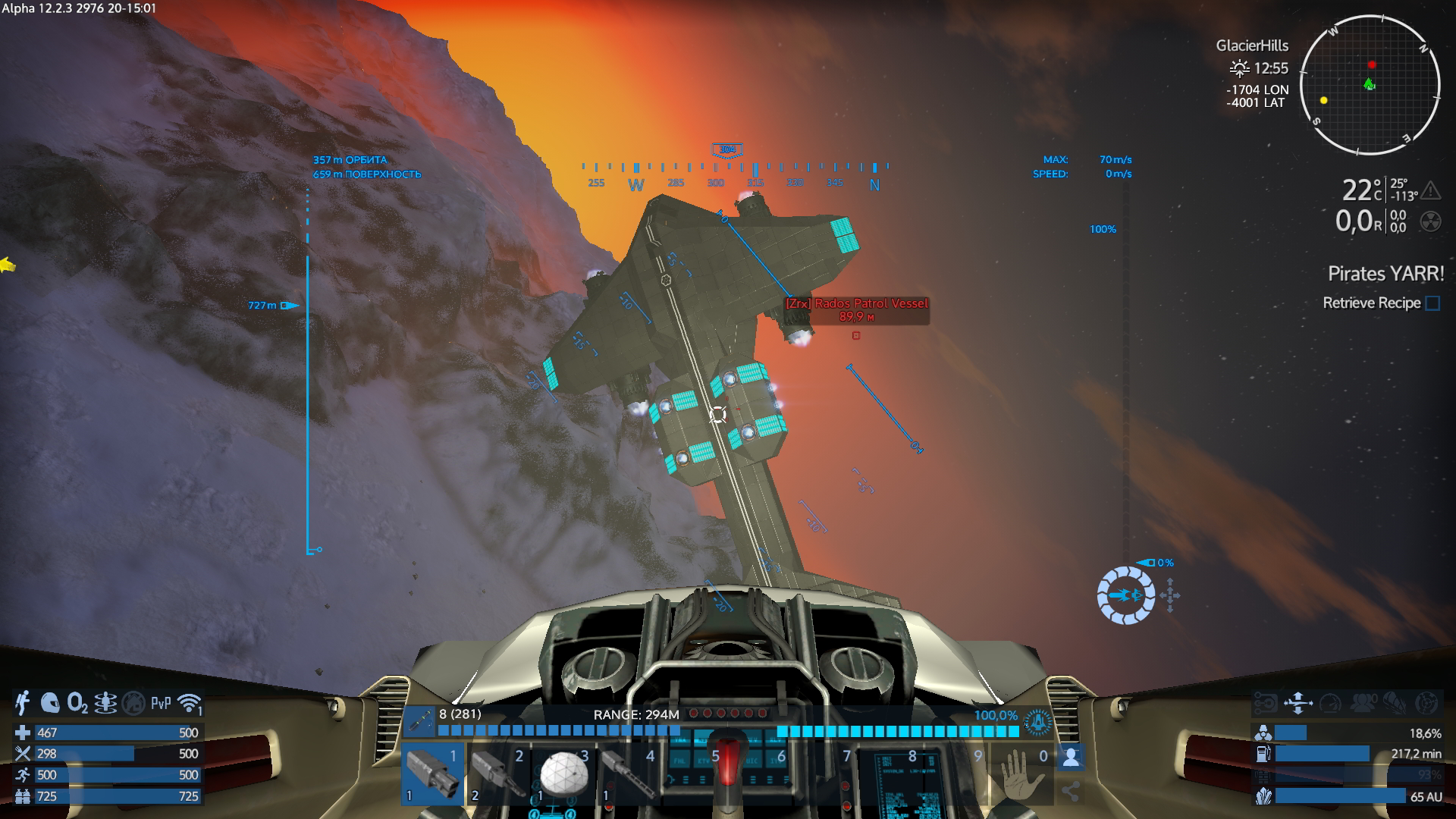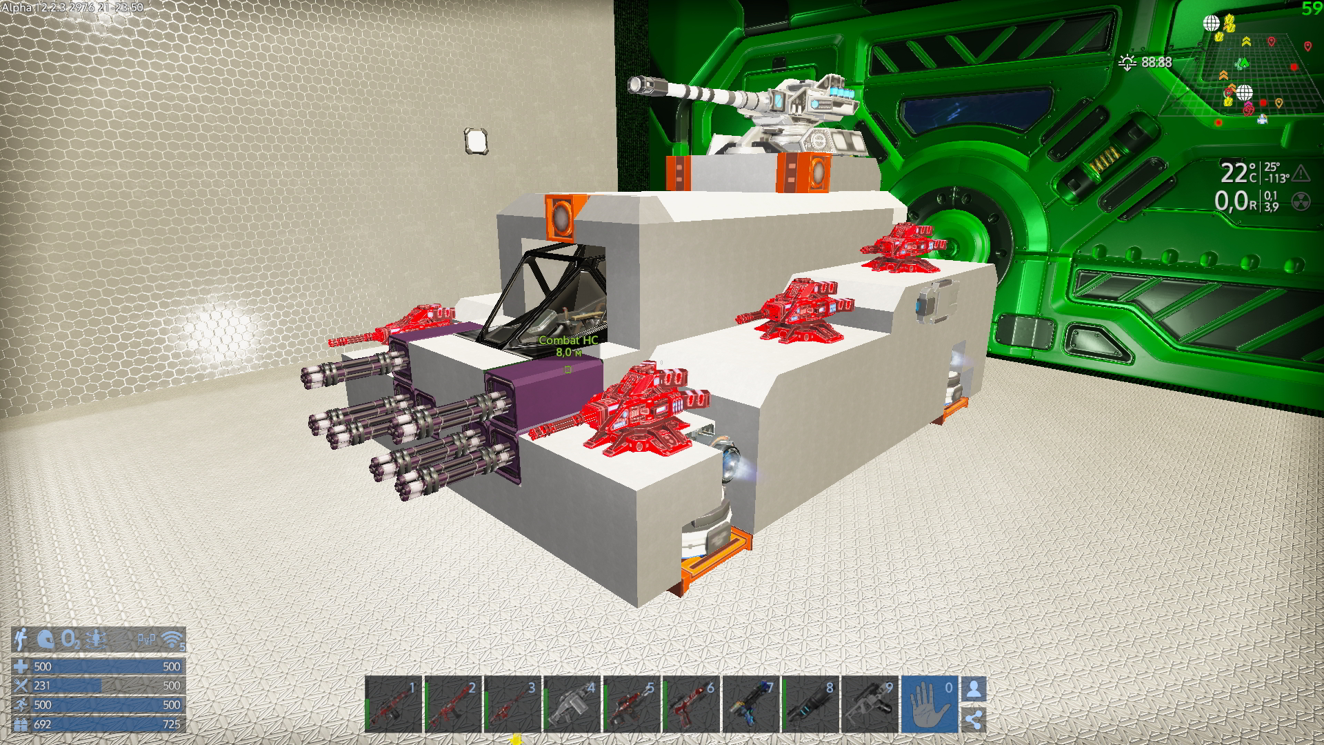 Если уровня и ресов на танк не хватает - можно стартануть новую игру (старые сейвы никуда не денутся) в креатив-режиме, нажать F2 и заспавнить танчик. Если нажать H - появится меню с халявным шмотом, там можно взять топлива для заправки и очищенного пентаксида для щита. Потом можно будет покататься и посмотреть.
