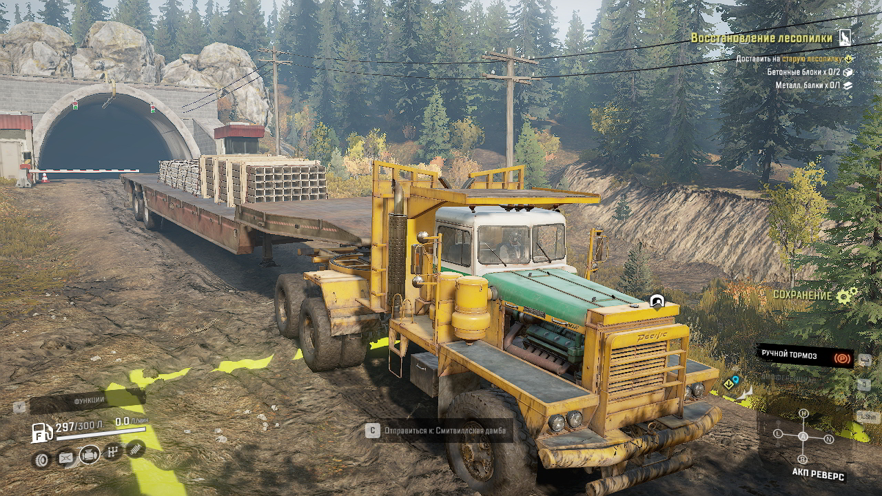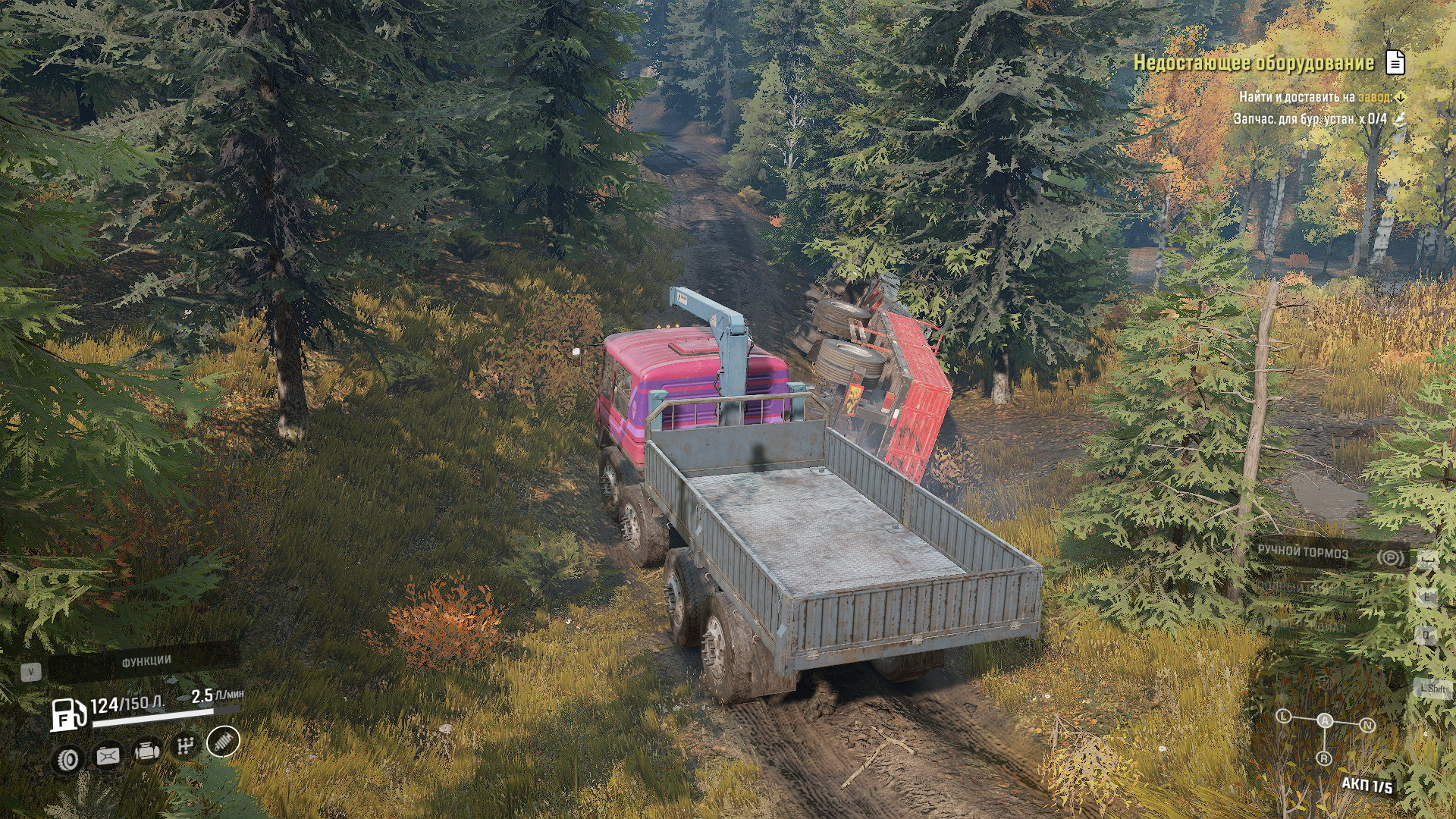 Собранный грузовичок будет и по относительной грязи хорошо лазать, и грузы доставать. На лесопилке или около склада с металлическими балками заберите короткий прицепчик, пригодится. Груз с прицепов скиньте краном на землю, он будет на карте подсвечен, когда понадобится по миссиям - заберёте.