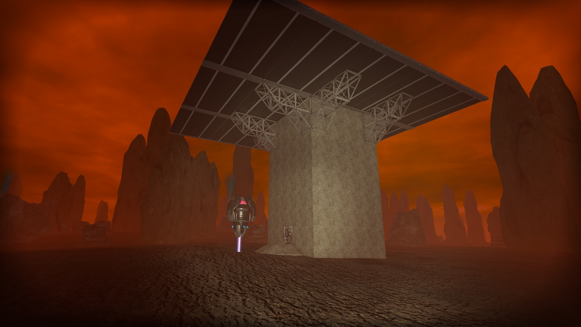 На 2-ом и 3-ем скринах телепортационная башня. Разработана специально для массового производства и установки на разных планетах для быстрого перемещения. Питание как автономное от солнечных панелей с аккумуляторами, так и в наличии есть резервный генератор, если по каким-то причинам аккумуляторы разрядятся, либо на планете будет недостаточное освещение.