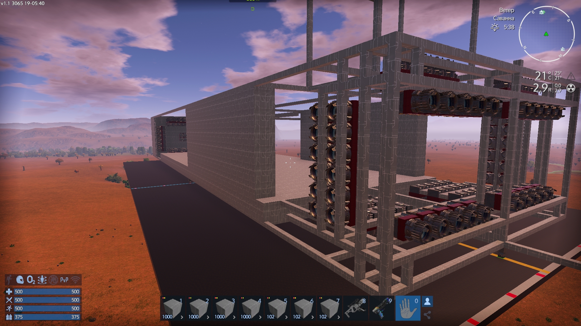 Сделал завод и телепортационную башню на сваях (чтобы компенсировать неровности рельефа в месте установки, чтобы не было перегрузов на конструкции, и они не обрушились после установки). Предполагается заглублять сваи в землю, но игра ставит их на поверхность. Хотя некоторые сваи немного сами заглубляются, если под средними "горб" земли, но если наоборот яма - крайние не заглубляются, а средние висят в воздухе, что может привести к обрушению здания под собственным весом.