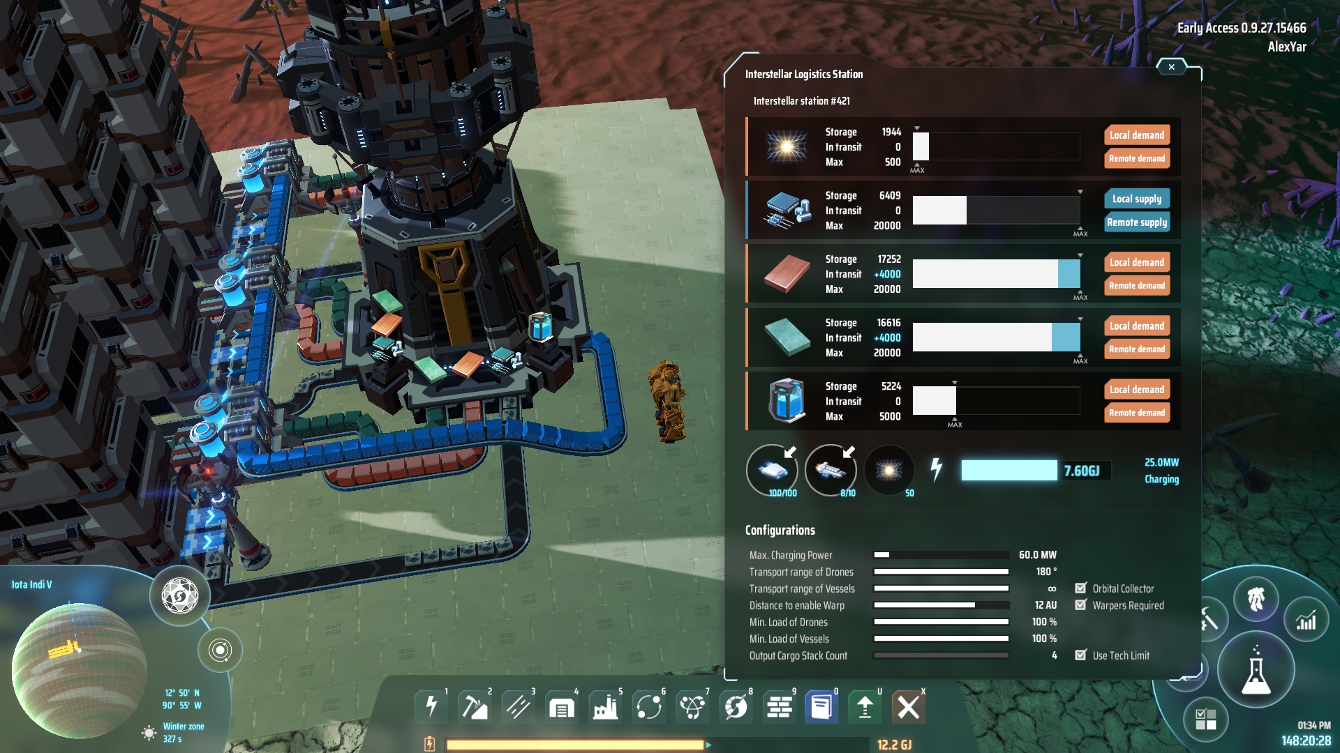 Стартовая система скоро будет выжата досуха, но уже вплотную подбираюсь к производству варпов. Собственно, техи уже открыты нужные, но не готова ещё обвязка для межзвёздной логистики - запас башен, челноков, дронов и прочего.