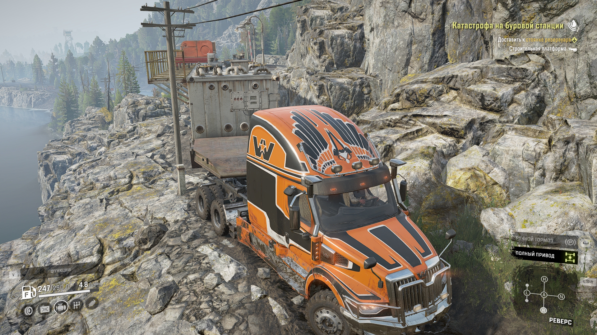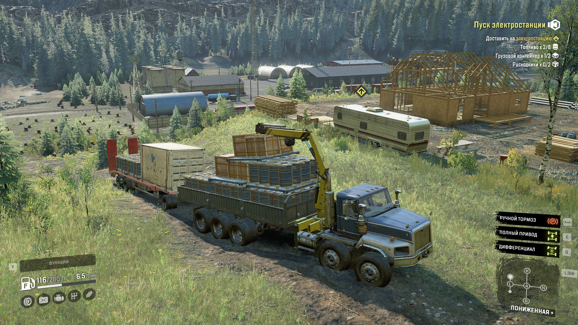 Есть ещё сложнее - это тащить строительную платформу. В гору её стопудово не затащить будет даже двумя 57Х, хотя попытаться придётся, так как это самый короткий путь (карьерник в Юконе они всё же притащили, хотя казалось, что он там намертво засел).