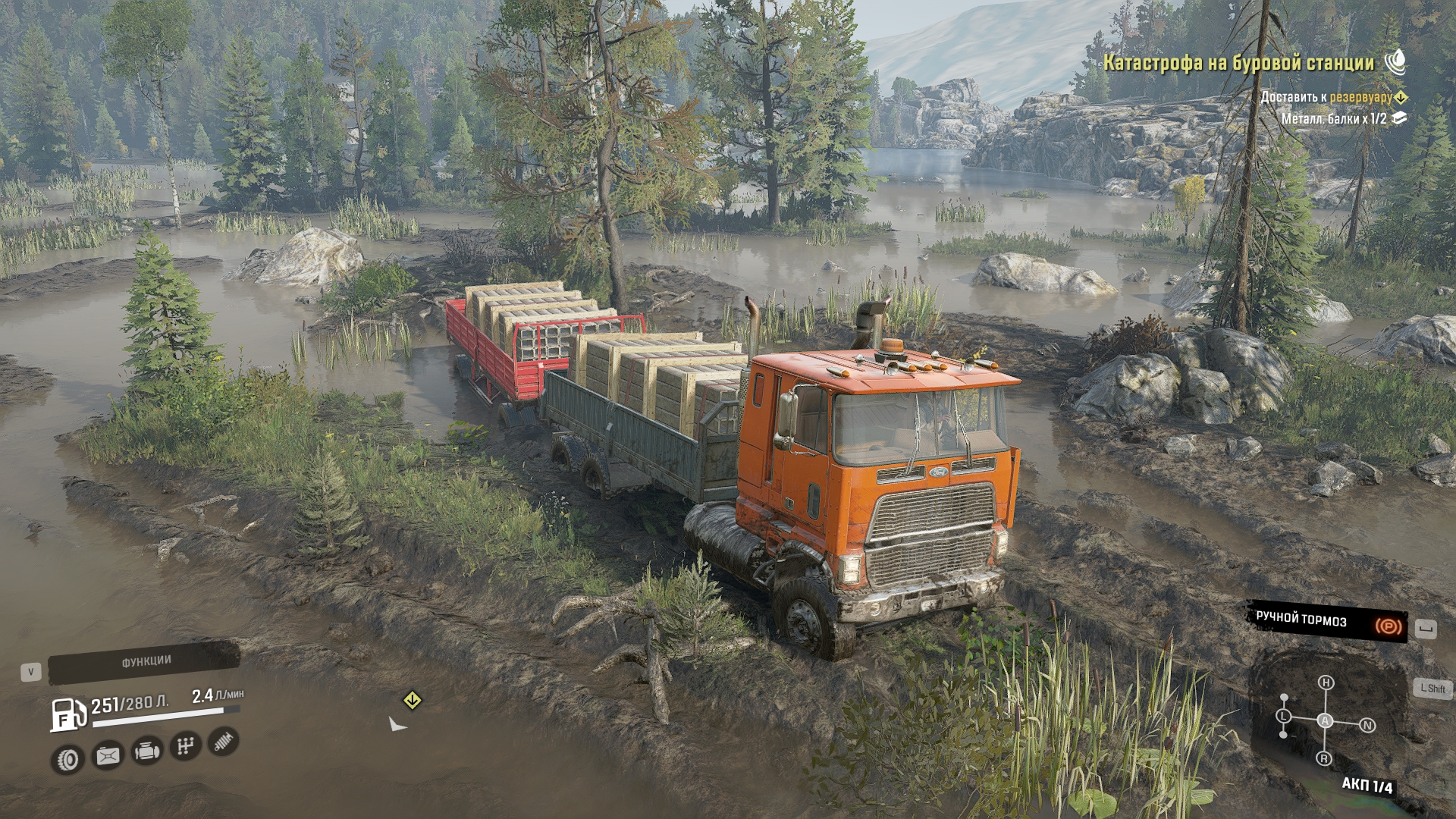 Значит тем путём можно не пытаться ехать, поеду в объезд по трассе и буду заезжать с болота в гору. Но та гора крутая шибко, ЦЛТ может не заехать, а если тянуть ГМС-ом - можно форда опрокинуть. Наверное, придётся перестраховаться и пригнать к подножию горы Транстар с лесокраном и ещё один Форд, но уже с грузовым кузовом. И везти брёвна рассыпухой до места, там уже перегружать и сдавать. Это одно из самых сложных заданий в этом регионе для шоссейников.