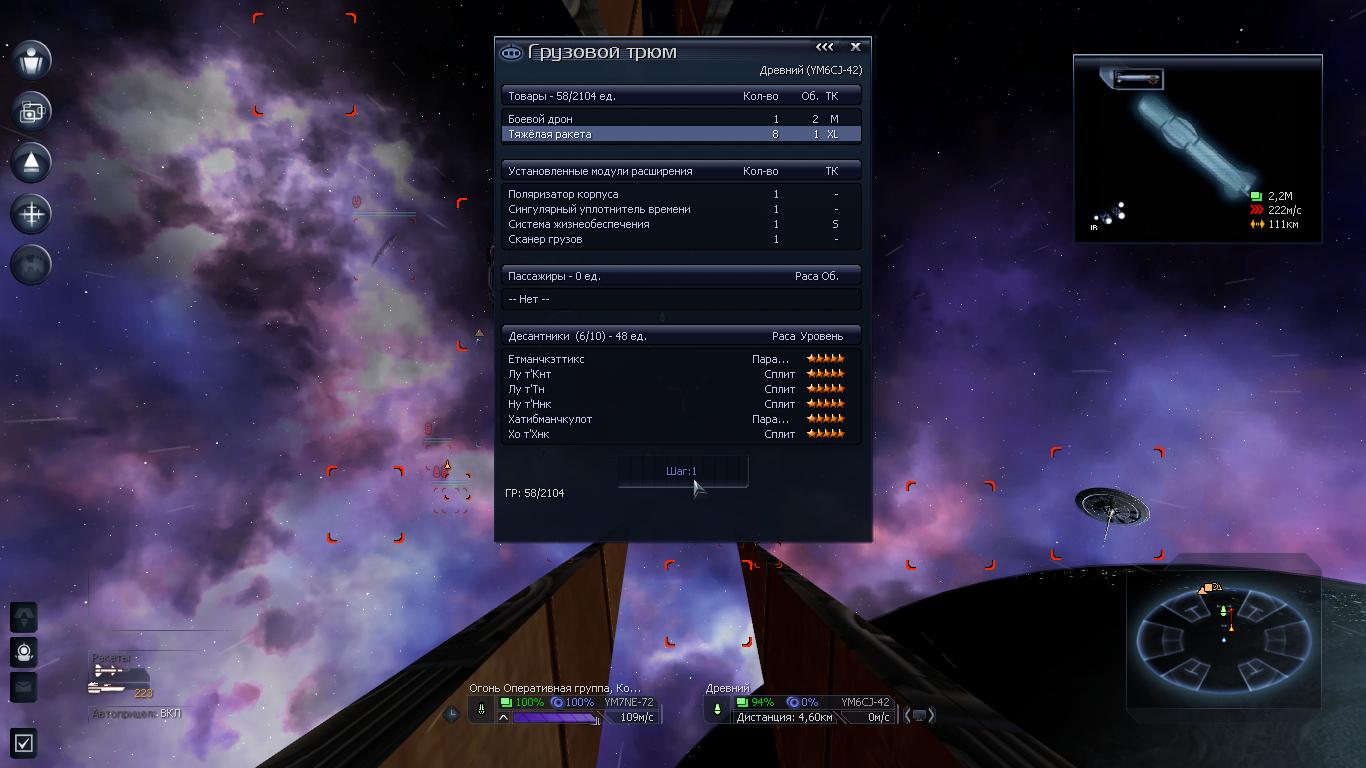 К пункту 5а добавлю, что спустя месяц после простейшего захвата с 1-й попытки М6 Вельзевул с щитами 3х1 ГДж в секторе Мгрофайя в ночь с 17 на 18 число из 5-6 десятков попыток наконец-то удался на отлично захват (сплитской Коброй по классике, М6 и просто М7 для этого не годились) в секторе Магия кристалла лучшего, самого мощного и защищённого М6 - Древний Харон (или просто Древний) с щитами 5х1 ГДж! Совершал залпы классическими ракетами - тяжёлыми торпедами "Молот" (вначале 2х8х300 и о ситуации), заградительными ракетами "Булава" и 2 абордажными капсулами. После первого абордажа все 10 десантников на 5 звёзд лягли (десант Древнего начитывал 10 человек со всеми характеристиками по 100.) Спустя время после расстрела 1-2 Архангелов 3-мя залпами ракеты Тайфун и запуска второй капсулы из 10 десантников прошли абордаж только 6, НО ЭТО был первый успешный захват в этом секторе Древних