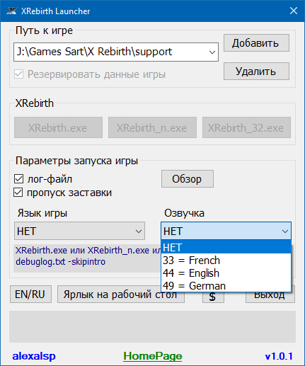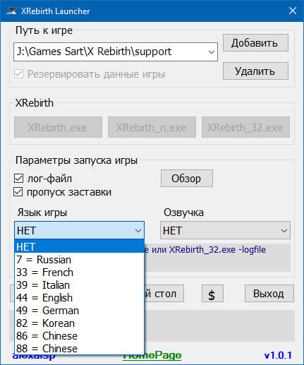 Лаунчер для удобного запуска игры XRebirth с поддержкой управления параметрами запуска, языковыми настройками и путями к установке игры.