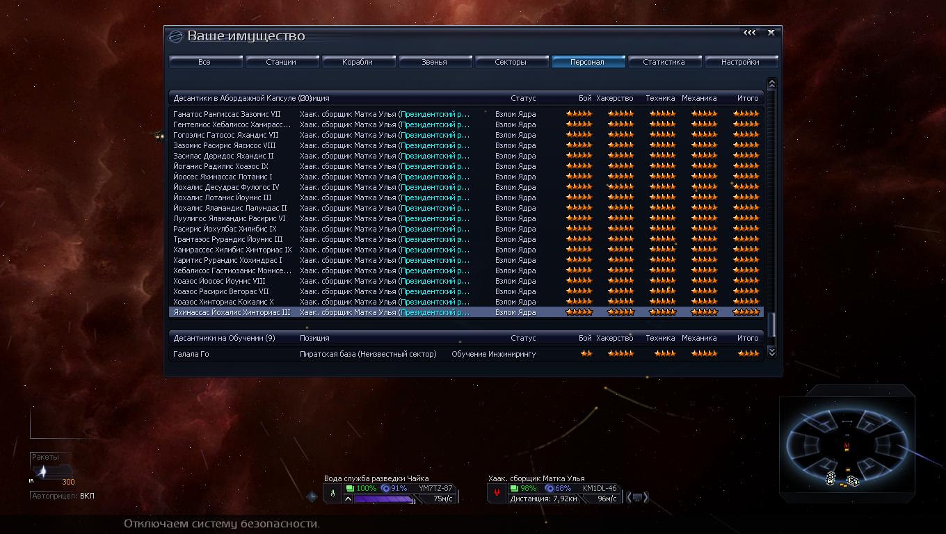 К пункту 5а добавлю, что спустя месяц после простейшего захвата с 1-й попытки М6 Вельзевул с щитами 3х1 ГДж в секторе Мгрофайя в ночь с 17 на 18 число из 5-6 десятков попыток наконец-то удался на отлично захват (сплитской Коброй по классике, М6 и просто М7 для этого не годились) в секторе Магия кристалла лучшего, самого мощного и защищённого М6 - Древний Харон (или просто Древний) с щитами 5х1 ГДж! Совершал залпы классическими ракетами - тяжёлыми торпедами "Молот" (вначале 2х8х300 и о ситуации), заградительными ракетами "Булава" и 2 абордажными капсулами. После первого абордажа все 10 десантников на 5 звёзд лягли (десант Древнего начитывал 10 человек со всеми характеристиками по 100.) Спустя время после расстрела 1-2 Архангелов 3-мя залпами ракеты Тайфун и запуска второй капсулы из 10 десантников прошли абордаж только 6, НО ЭТО был первый успешный захват в этом секторе Древних