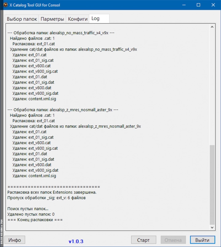 • Формат лога: "Обработка: filename.cat (папка: folder_name)"