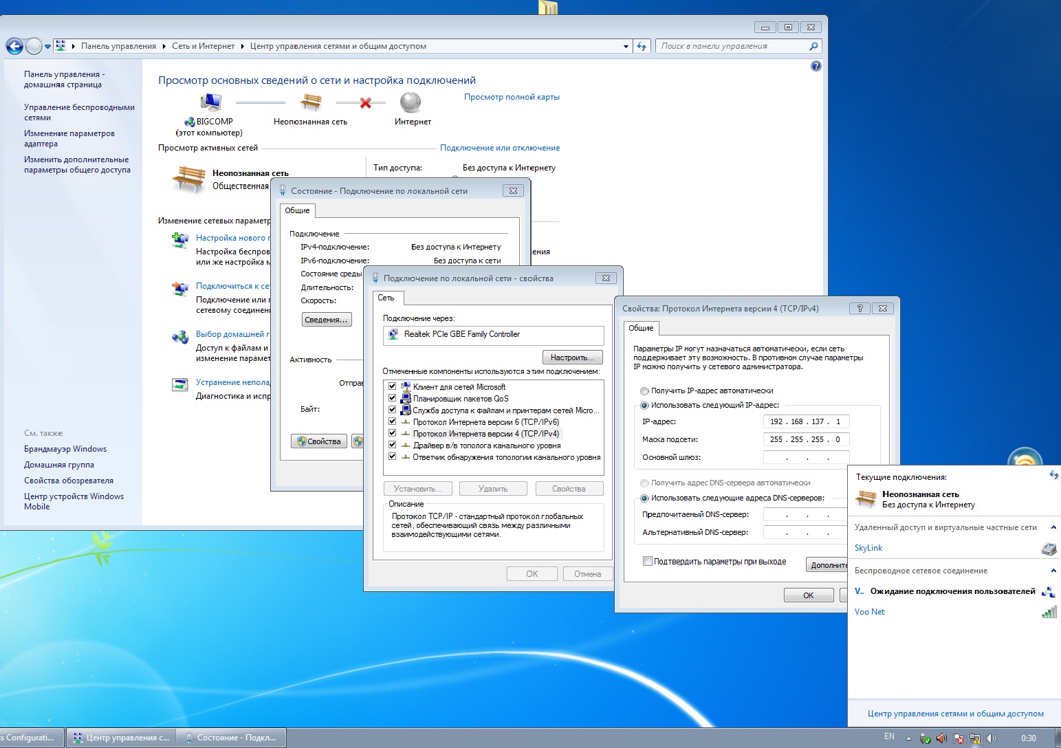 2.Далее создаешь соеденение для подлючения к Интернету уже на своём компьютере.Ничего сложного,думаю разберёшься.Попробуй выйти в Интернет.Получилось? Если да,тогда читай далее,если нет,тогда неправильно всё настроил.