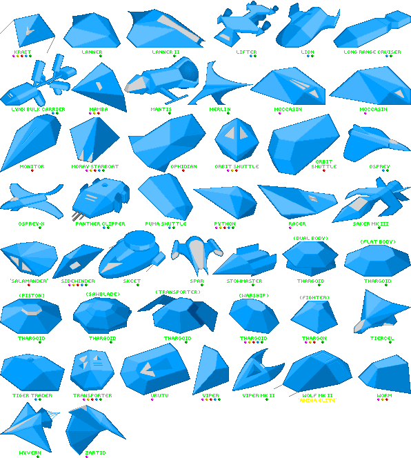 - ELITE означает, что корабль присутствовал только в первоначальной версии -=ELITE=- - Написано только а значки присутствуют на Thargoid Transporter и Unknown Thargoid 4 (Thargon) вместе со значком FFE. Может просто после каждого корабля поставить значки где он есть?