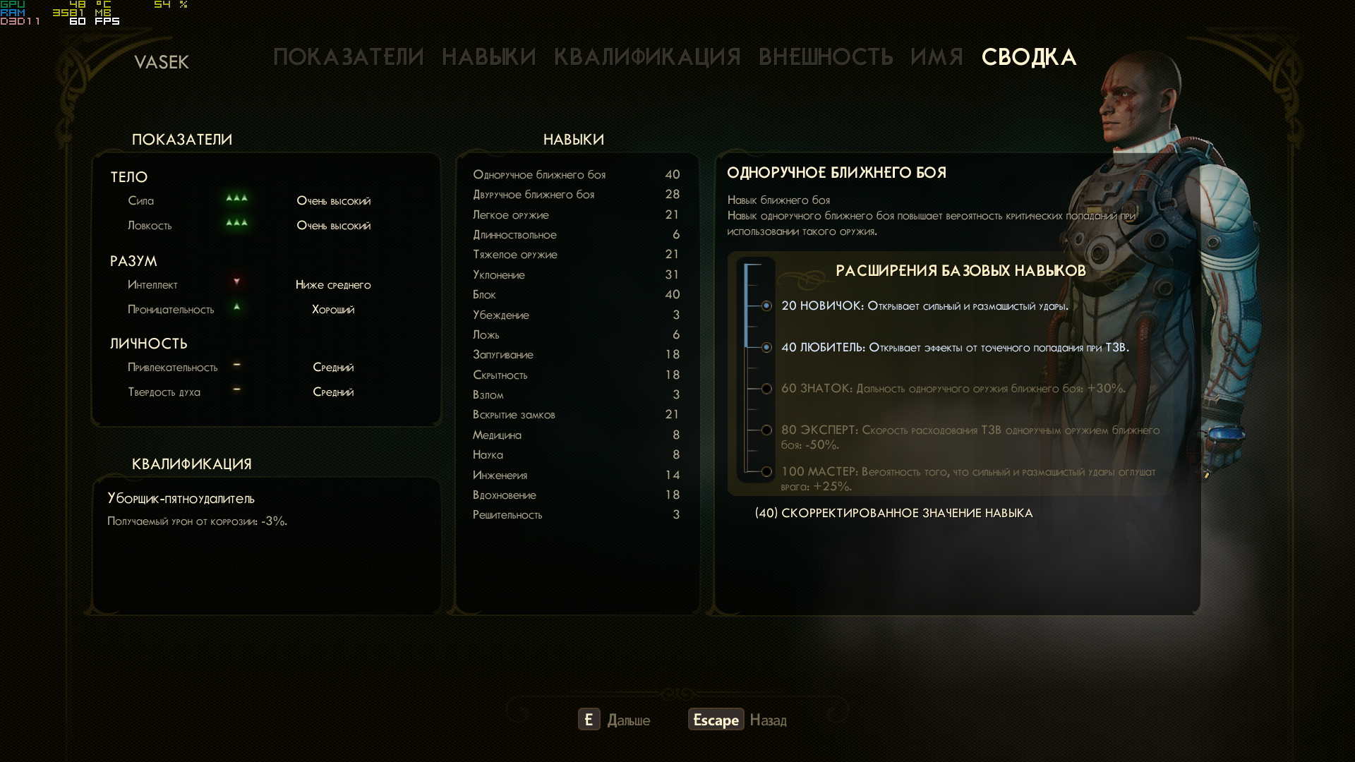 И с навыками тоже вилка нехилая, так как можно только в 2 ветки вложиться, а у нас на выбор ближ.бой, защита/уклонение, скрытность, навыки общения (помогают в бою различными эффектами на врагов, плюс можно доп.выгоду получать), т.е. как минимум 4.