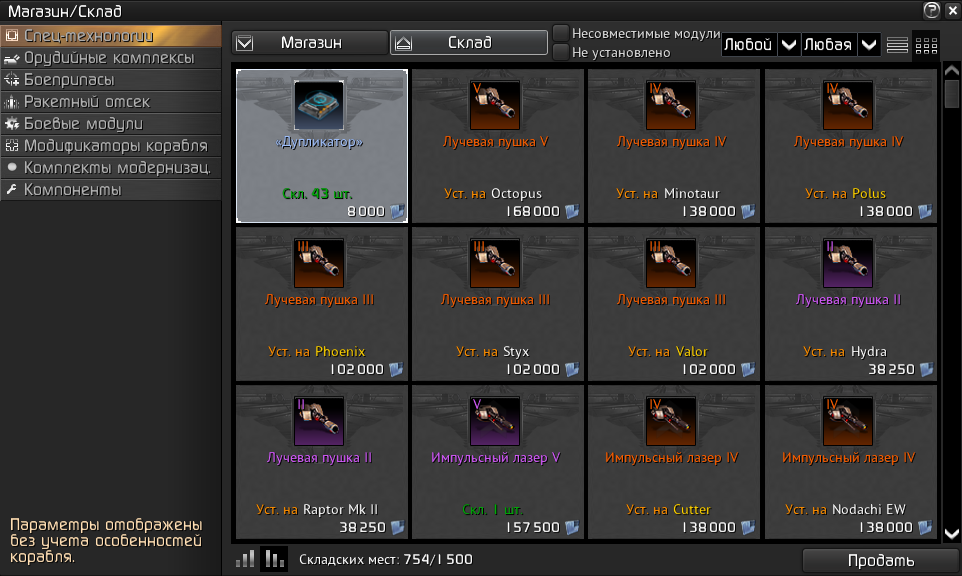 Так же в игре есть орудия. Они уникальны для каждого класса. (Орудия перехватчиков нельзя установить на фрегаты и наоборот).