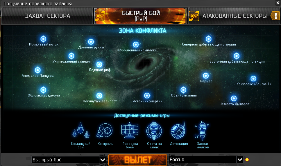 Контроль. Есть всего 3 маяка на две команды. При контроле двух и более, у врагов начинается обратный отсчет очков. Как только счетчик одной из команд дойдет до нуля, та команда проиграет. В данном режиме вы можете вылетать на одном и том же корабле сколько угодно.