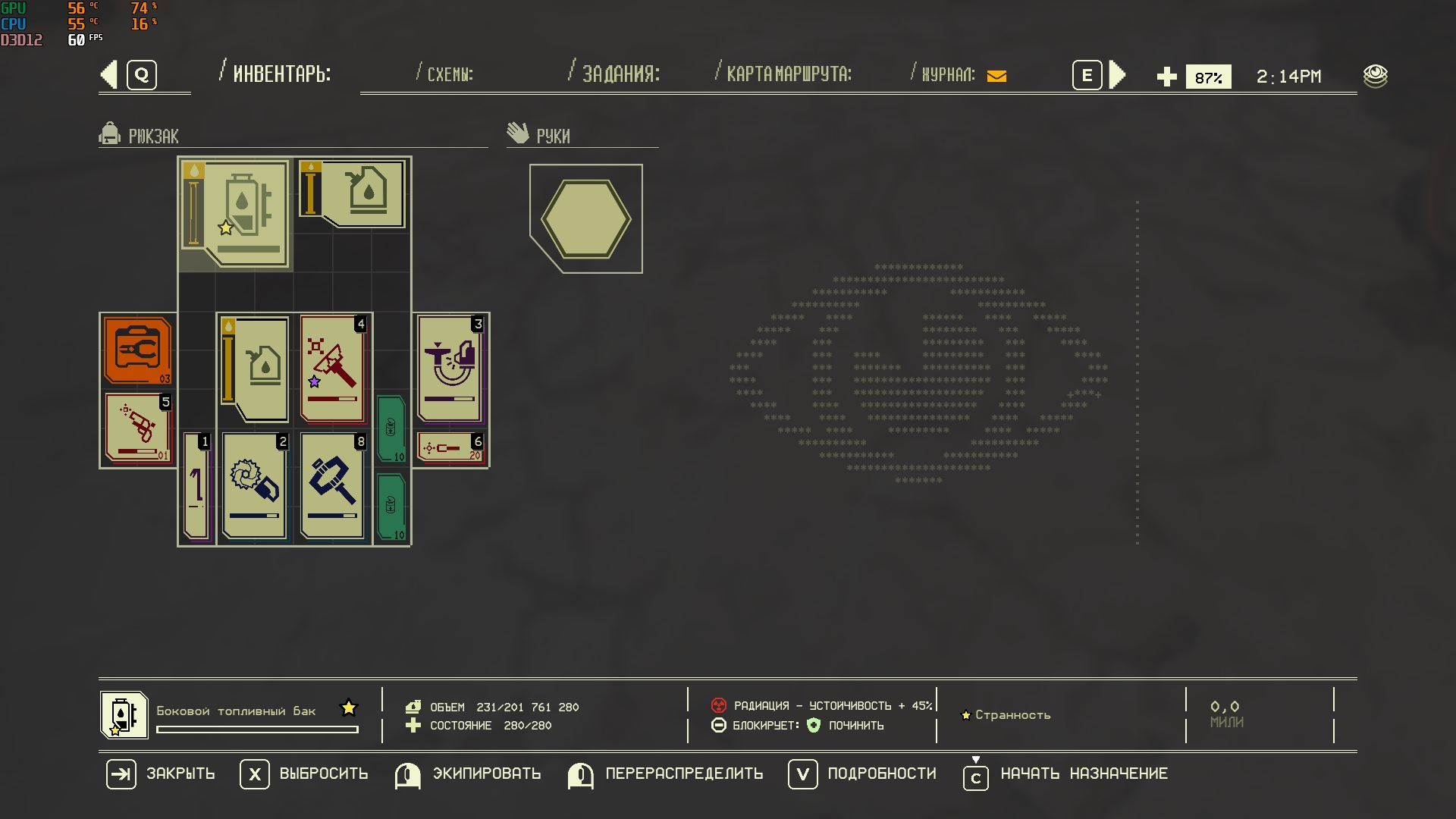 Ну и насобирал ресов для большого рюкзака, поставил его и... ОБНАРУЖИЛ БАГ с исчезнувшим инвентарём вообще