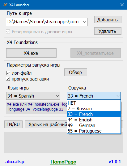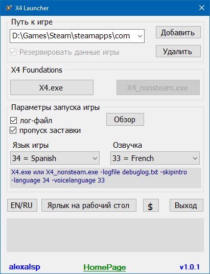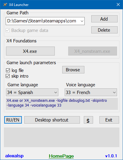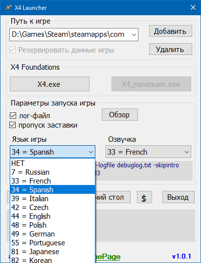Лаунчер для удобного запуска игры X4: Foundations с поддержкой управления параметрами запуска, языковыми настройками и путями к установке игры.