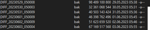 Скорее всего, дифы инкрементальные. т.е. дифф не от полного бэкапа, а от предыдущего.