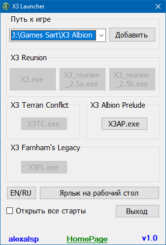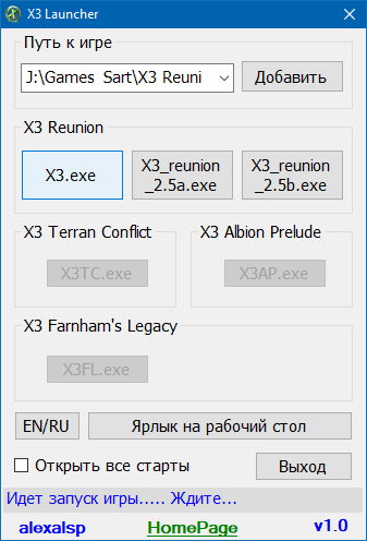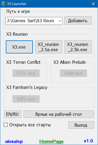 - X3: Reunion (с поддержкой версий: X3.exe, X3_reunion_2.5a.exe, X3_reunion_2.5b.exe)