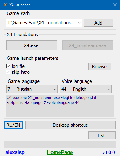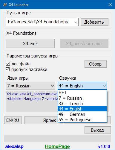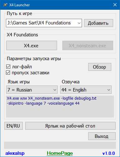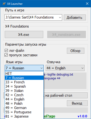 Лаунчер для удобного запуска игры X4: Foundations с поддержкой управления параметрами запуска, языковыми настройками и путями к установке игры.