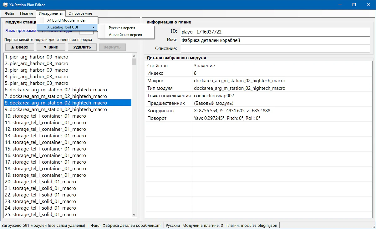 Утилита для редактирования XML-планов станций X4: Foundations. Позволяет перестраивать очередь строительства, управлять зависимостями модулей и анализировать вооружение без запуска игры.