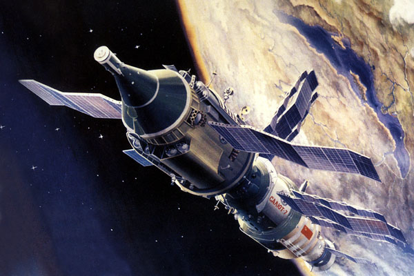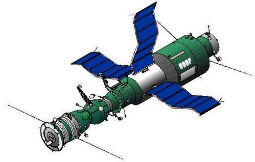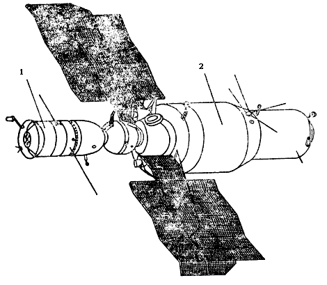 Эпизод четвертый Разные на орбите под одной личиной. С учетом работы первой станции «Салют», уже через год была подготовлена «ДОС-2», попытка запуска которой 29 июля 1972 г. была неудачной из-за аварии носителя на участке работы второй ступени. А тем временем в ЦКБМ и на заводе им. Хруничева шла работа над первой ОПС «Алмаз». Наземная отработка станции при комплексном испытании всех систем была завершена к 1973 г. И уже к весне планировалось запустить станцию. ![]() Рис. 4. ОПС «Алмаз» («Салют-2») c ТКС и КК 7К-Т «Алмаз» взлетел 3-го апреля 1973 года, получив официальное наименование «Салют-2». Экспедицию для него собрали еще в сентябре 1972 года на новой модификации «Союза» 7К-ТА. Её состав должен был быть таким: 1.П.Попович/СССР/-командир-2 полёт 2. Ю.Артюхин/СССР/-бортинженер-1 полёт дублёры 1. Г.Сарафанов/СССР/-1 полёт 2.Л.Дёмин /СССР/-1 полёт С нового союза сняли солнечные батареи, оставив только аккумуляторы, что сократило время жизни КК до двух суток. Предполагалось, что после стыковки Союз подключится к солнечным батареям «Салюта-2» и подзарядит батареи. Но и тут в дело вмешалось невезение. На 13-е сутки произошла полная разгерметизация станции, вслед за которой по очереди отказали практически всё системы. После анализа телеметрической информации, наиболее вероятной причиной аварии была признана неисправность, возникшая в двигателях ориентации и приведшая к прогоранию в корпусе ОПС. Станция «Салют-2» постепенно сошла с орбиты и упала в океан. А новый «Союз», приготовленный для экспедиции, совершил беспилотный полет в испытательных целях. Точно также не везло и ДОСам. Построенная на заводе им. Хруничева «ДОС-3», имела некоторые отличия от станций «ДОС-1 и -2». В частности, предполагалось использовать на станции три большие поворачивающиеся солнечные батареи, предназначенные для ТКС, что более чем вдвое увеличивало мощность систем электропитания и избавляло от необходимости поддерживать ориентацию станции на Солнце. Экспедиция на ДОС-3 была утверждена в 1972-ом году: 1.А.Леонов /СССР/-командир-2 полёт 2.В.Кубасов/СССР/-бортинженер-2 полёт дублёры 1.В.Лазарев//СССР/-1 полёт 2.О.Макаров/СССР/-1 полёт Но ей так и не суждено было стартовать. Запуск станции 5 ноября 1973 года обернулся аварией, произошедшей в системе ориентации и управления движением «ДОС». Телеметрия уже выведенной на орбиту станции регистрирует сбои по ионным датчикам, приведшие к выработке всего топлива двигателями ориентации. Станция, получив обозначение «Космос-637», некоторое время совершала пассивный полет. После выдачи команды на подъем орбиты, «ДОС-3» из-за неправильной ориентации вошла в атмосферу и прекратила свое существование. «Салют-3» он же ОПС «Алмаз-2» был выведен на орбиту 25-ого июня 1974 года. Автономный полет станции протекал нормально, и обе запланированные еще в 1973 году экспедиции были утверждены и подготовлены для полета на станцию. Первая экспедиция: 1. П.Попович /СССР/ командир 2 полёт 2. Ю.Артюхин /СССР/ бортинженер 1 полёт дублёры 1. Г.Сарафанов /СССР/ 1 полёт 2. Л.Дёмин /СССР/ 1 полёт Экипаж без каких-либо осложнений стартовал 3-го июля 1974 года на корабле «Союз-14», успешно состыковался со станцией, и провел в космосе 16 суток, полностью выполнив все поставленные задачи. ![]() Рис.5. Станция «Салют-3» (ОПС-2 «Алмаз»): 1 корабль «Союз-14»; 2 станция «Алмаз Характерными особенностями данной станции явля