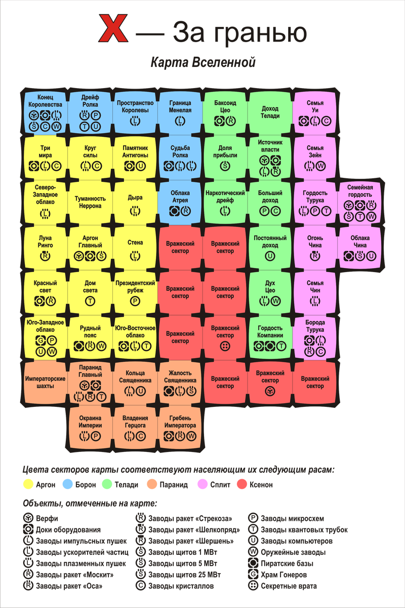 Удобная цветная карта в формате Corel Draw для печати в любом разрешении. Названия секторов на русском языке, в каждом секторе обозначены стратегически важные объекты (верфи, доки оборудования, пиратские базы, фабрики хайтека, пушек, лазеров, ракет и другие). Автор - Example626.